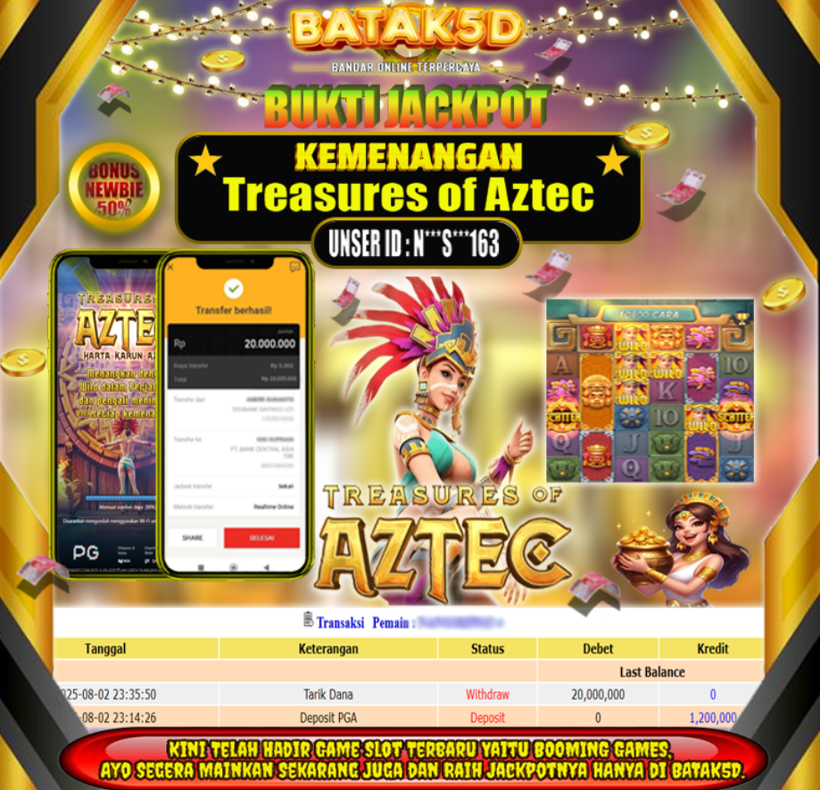 Selamat Kepada Member Setia BATAK5D dengan USER ID : N***S***163 di JACKPOT KEMENANGAN , TREASURES OF AZTEC RP.20,000,000 LUNAS langsung mendarat ke rekening tanpa bertele – tele. Terimakasih telah mempercayakan BATAK5D sebagai Situs Bandar Terpercaya dan Terjamin Aman! Tunggu apalagi? Daftar sekarang juga bersama BATAK5D dan dapatkan berbagai promo menarik setiap harinya.
