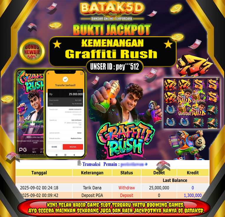 Selamat Kepada Member Setia BATAK5D dengan USER ID :PEY***512 di JACKPOT KEMENANGAN, GRAFFITI RUSH RP.25,000,000 LUNAS langsung mendarat ke rekening tanpa bertele – tele. Terimakasih telah mempercayakan BATAK5D sebagai Situs Bandar Terpercaya dan Terjamin Aman! Tunggu apalagi? Daftar sekarang juga bersama BATAK5D dan dapatkan berbagai promo menarik setiap harinya.