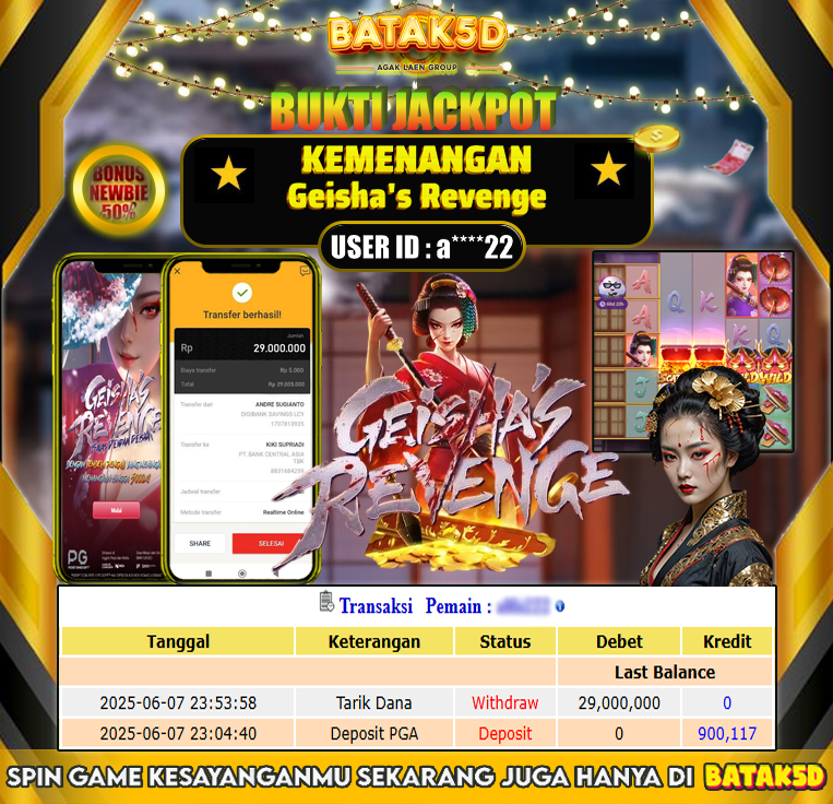 Selamat Kepada Member Setia BATAK5D dengan USER ID : a****22 di JACKPOT KEMENANGAN , Geisha s Revenge RP.29,000,000 LUNAS langsung mendarat ke rekening tanpa bertele – tele. Terimakasih telah mempercayakan BATAK5D sebagai Situs Bandar Terpercaya dan Terjamin Aman! Tunggu apalagi? Daftar sekarang juga bersama BATAK5D dan dapatkan berbagai promo menarik setiap harinya.