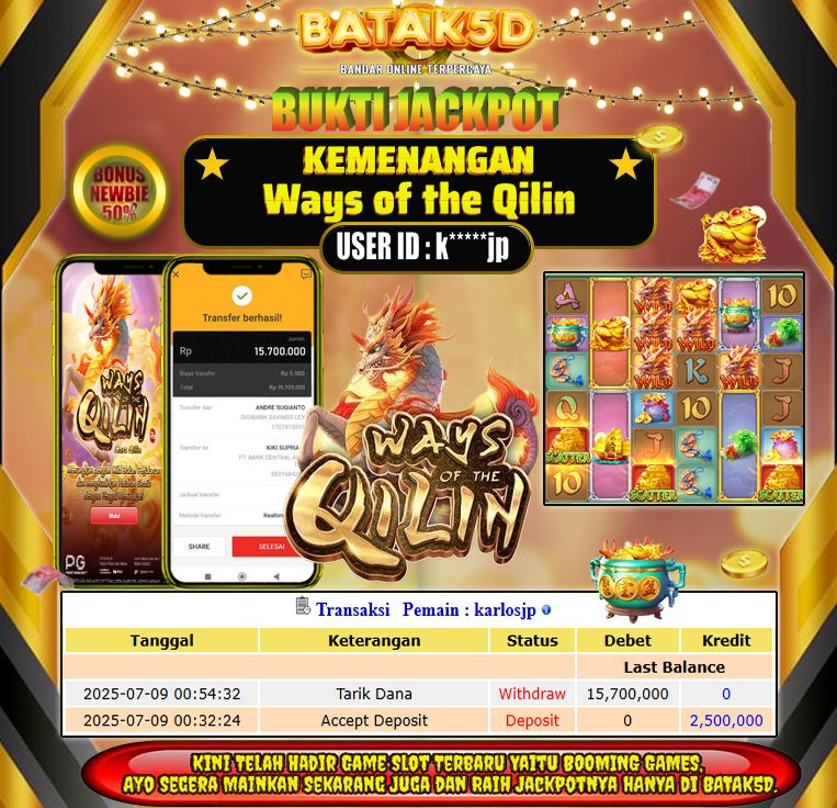 Selamat Kepada Member Setia BATAK5D dengan USER ID : k*****jp di JACKPOT KEMENANGAN , Ways Of The Qilin RP.15,700,000 LUNAS langsung mendarat ke rekening tanpa bertele – tele. Terimakasih telah mempercayakan BATAK5D sebagai Situs Bandar Terpercaya dan Terjamin Aman! Tunggu apalagi? Daftar sekarang juga bersama BATAK5D dan dapatkan berbagai promo menarik setiap harinya.