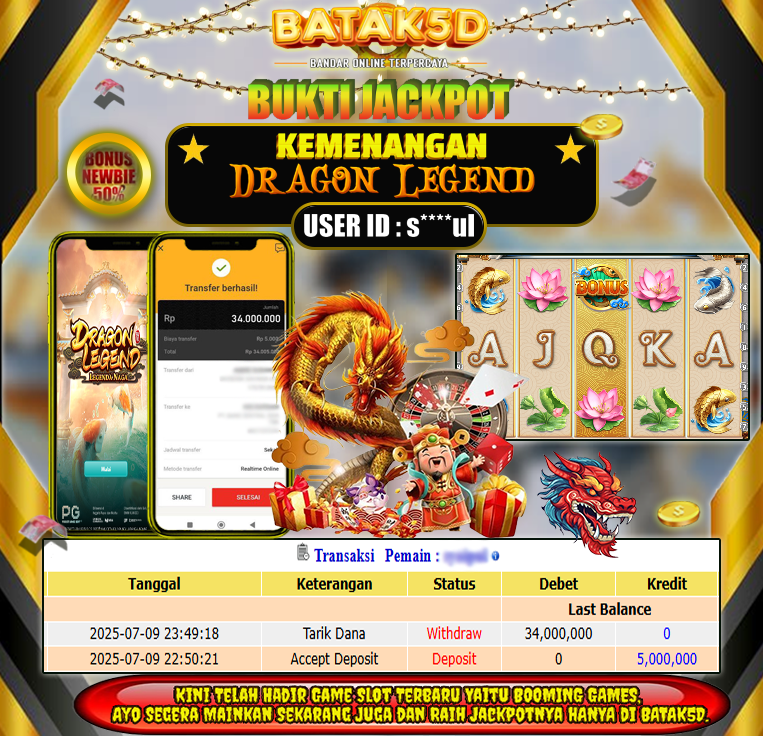Selamat Kepada Member Setia BATAK5D dengan USER ID : s***ul di JACKPOT KEMENANGAN , Dragon Legend RP.34,000,000 LUNAS langsung mendarat ke rekening tanpa bertele – tele. Terimakasih telah mempercayakan BATAK5D sebagai Situs Bandar Terpercaya dan Terjamin Aman! Tunggu apalagi? Daftar sekarang juga bersama BATAK5D dan dapatkan berbagai promo menarik setiap harinya.