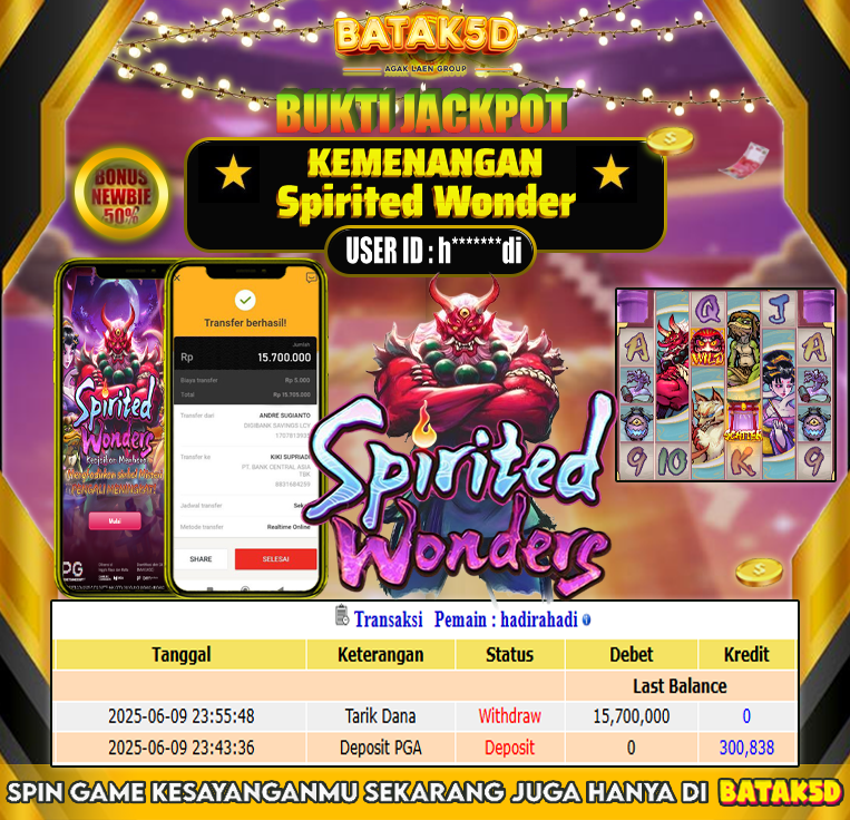 Selamat Kepada Member Setia BATAK5D dengan USER ID : h*******di di JACKPOT KEMENANGAN , Spirited Wonder RP.15,700,000 LUNAS langsung mendarat ke rekening tanpa bertele – tele. Terimakasih telah mempercayakan BATAK5D sebagai Situs Bandar Terpercaya dan Terjamin Aman! Tunggu apalagi? Daftar sekarang juga bersama BATAK5D dan dapatkan berbagai promo menarik setiap harinya.