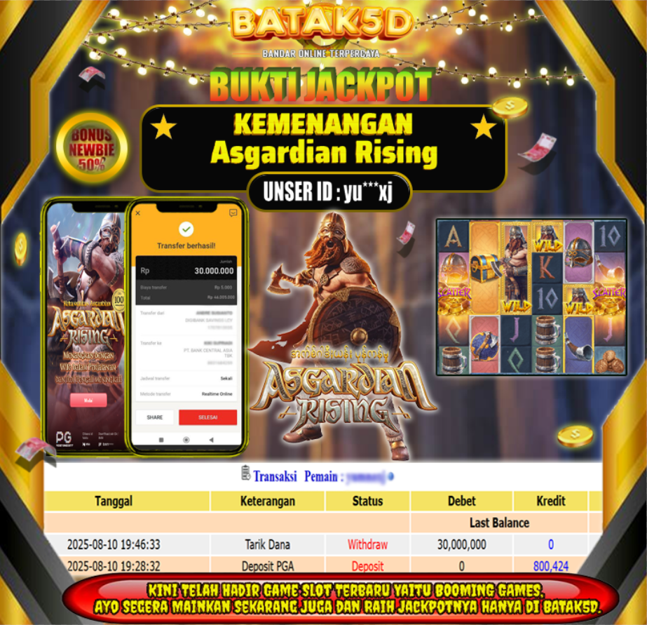 Selamat Kepada Member Setia BATAK5D dengan USER ID : YU****XJ di JACKPOT KEMENANGAN, Asgardian Rising RP.30,000,000 LUNAS langsung mendarat ke rekening tanpa bertele – tele. Terimakasih telah mempercayakan BATAK5D sebagai Situs Bandar Terpercaya dan Terjamin Aman! Tunggu apalagi? Daftar sekarang juga bersama BATAK5D dan dapatkan berbagai promo menarik setiap harinya.