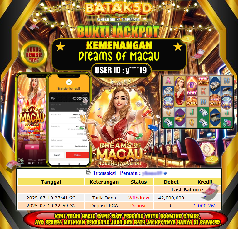 Selamat Kepada Member Setia BATAK5D dengan USER ID : y****19 di JACKPOT KEMENANGAN , Dreans Of Macau RP.42,000,000 LUNAS langsung mendarat ke rekening tanpa bertele – tele. Terimakasih telah mempercayakan BATAK5D sebagai Situs Bandar Terpercaya dan Terjamin Aman! Tunggu apalagi? Daftar sekarang juga bersama BATAK5D dan dapatkan berbagai promo menarik setiap harinya.