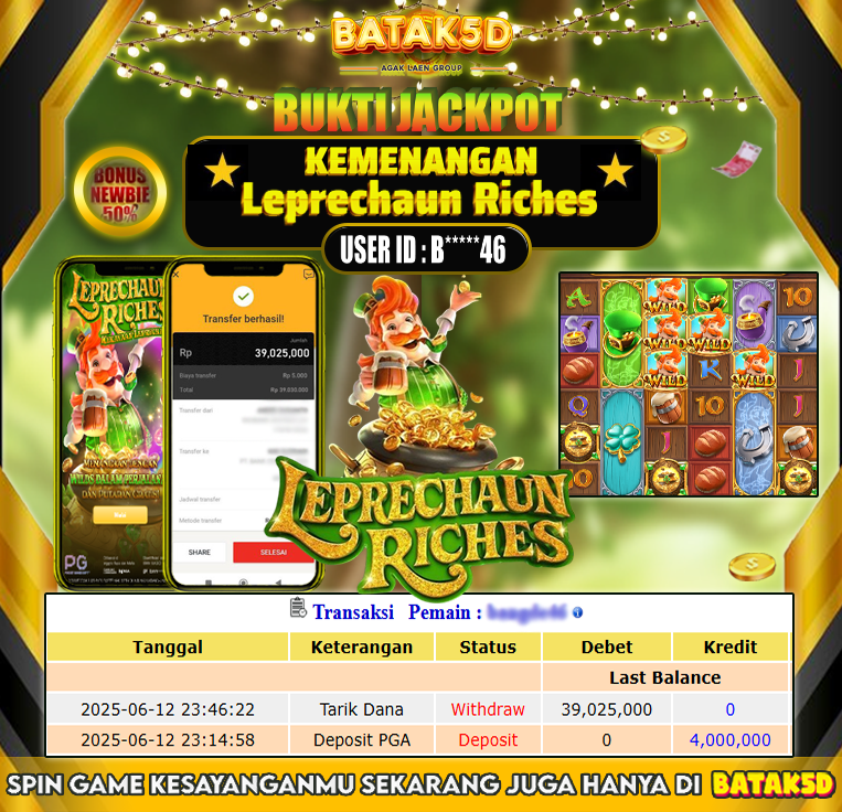 Selamat Kepada Member Setia BATAK5D dengan USER ID : B*****46 di JACKPOT KEMENANGAN , Leprechaun Riches RP.39,025,000 LUNAS langsung mendarat ke rekening tanpa bertele – tele. Terimakasih telah mempercayakan BATAK5D sebagai Situs Bandar Terpercaya dan Terjamin Aman! Tunggu apalagi? Daftar sekarang juga bersama BATAK5D dan dapatkan berbagai promo menarik setiap harinya.