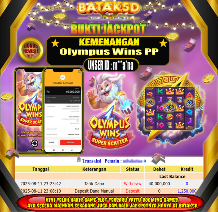 Selamat Kepada Member Setia BATAK5D dengan USER ID : M***A*NA di JACKPOT KEMENANGAN, Olympus Wins PP RP.40,000,000 LUNAS langsung mendarat ke rekening tanpa bertele – tele. Terimakasih telah mempercayakan BATAK5D sebagai Situs Bandar Terpercaya dan Terjamin Aman! Tunggu apalagi? Daftar sekarang juga bersama BATAK5D dan dapatkan berbagai promo menarik setiap harinya.