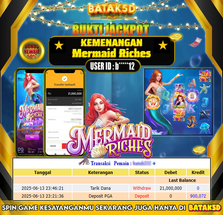 Selamat Kepada Member Setia BATAK5D dengan USER ID : b*****12 di JACKPOT KEMENANGAN , Mermaid Riches RP.21,000,000 LUNAS langsung mendarat ke rekening tanpa bertele – tele. Terimakasih telah mempercayakan BATAK5D sebagai Situs Bandar Terpercaya dan Terjamin Aman! Tunggu apalagi? Daftar sekarang juga bersama BATAK5D dan dapatkan berbagai promo menarik setiap harinya.