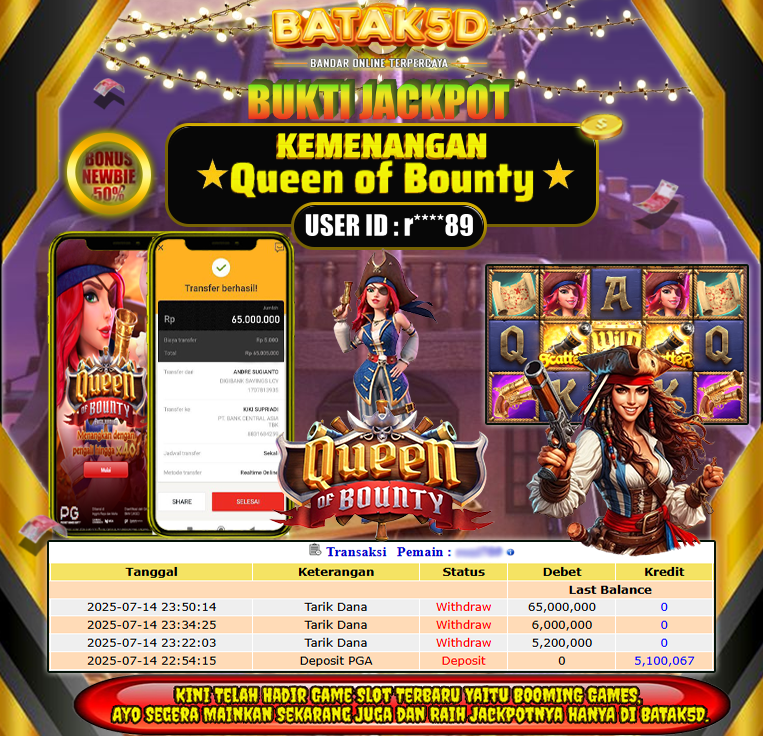 Selamat Kepada Member Setia BATAK5D dengan USER ID : r****89 di JACKPOT KEMENANGAN , Queen Of Bounty RP.5,200,000 // 6,000 000 // 65,000,000 LUNAS langsung mendarat ke rekening tanpa bertele – tele. Terimakasih telah mempercayakan BATAK5D sebagai Situs Bandar Terpercaya dan Terjamin Aman! Tunggu apalagi? Daftar sekarang juga bersama BATAK5D dan dapatkan berbagai promo menarik setiap harinya.
