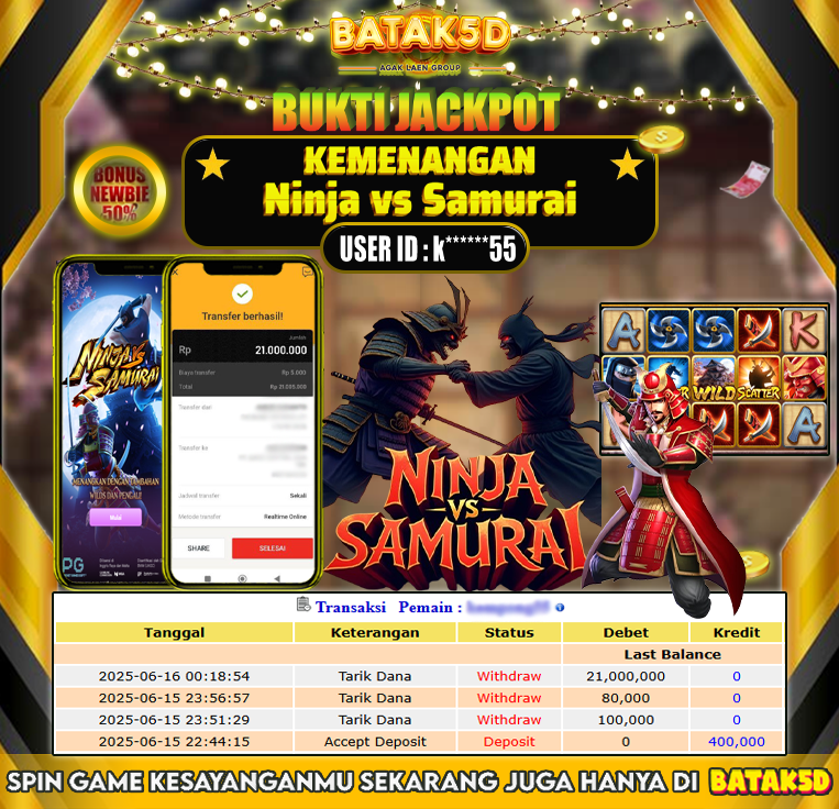 Selamat Kepada Member Setia BATAK5D dengan USER ID : k******55 di JACKPOT KEMENANGAN , Ninja vs Samural RP.21,000,000 LUNAS langsung mendarat ke rekening tanpa bertele – tele. Terimakasih telah mempercayakan BATAK5D sebagai Situs Bandar Terpercaya dan Terjamin Aman! Tunggu apalagi? Daftar sekarang juga bersama BATAK5D dan dapatkan berbagai promo menarik setiap harinya.