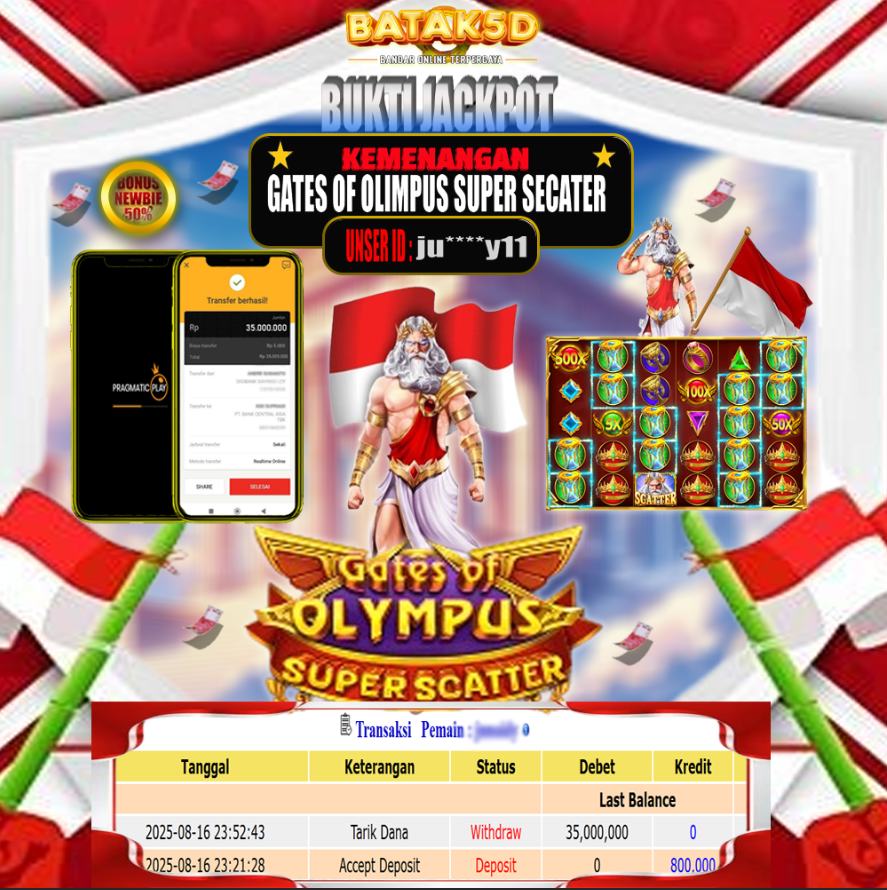 Selamat Kepada Member Setia BATAK5D dengan USER ID :JU****Y11 di JACKPOT KEMENANGAN, GATE OLYMPUS SUPER SECATER RP.35,000,000 LUNAS langsung mendarat ke rekening tanpa bertele – tele. Terimakasih telah mempercayakan BATAK5D sebagai Situs Bandar Terpercaya dan Terjamin Aman! Tunggu apalagi? Daftar sekarang juga bersama BATAK5D dan dapatkan berbagai promo menarik setiap harinya.