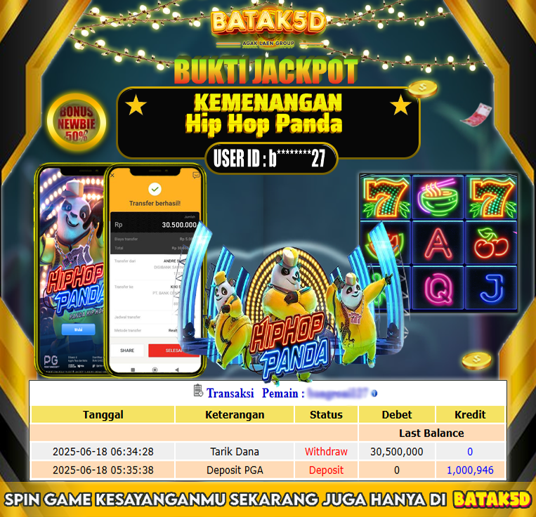 Selamat Kepada Member Setia BATAK5D dengan USER ID : b********27 di JACKPOT KEMENANGAN , Hip Hop Panda RP.30,500,000 LUNAS langsung mendarat ke rekening tanpa bertele – tele. Terimakasih telah mempercayakan BATAK5D sebagai Situs Bandar Terpercaya dan Terjamin Aman! Tunggu apalagi? Daftar sekarang juga bersama BATAK5D dan dapatkan berbagai promo menarik setiap harinya.