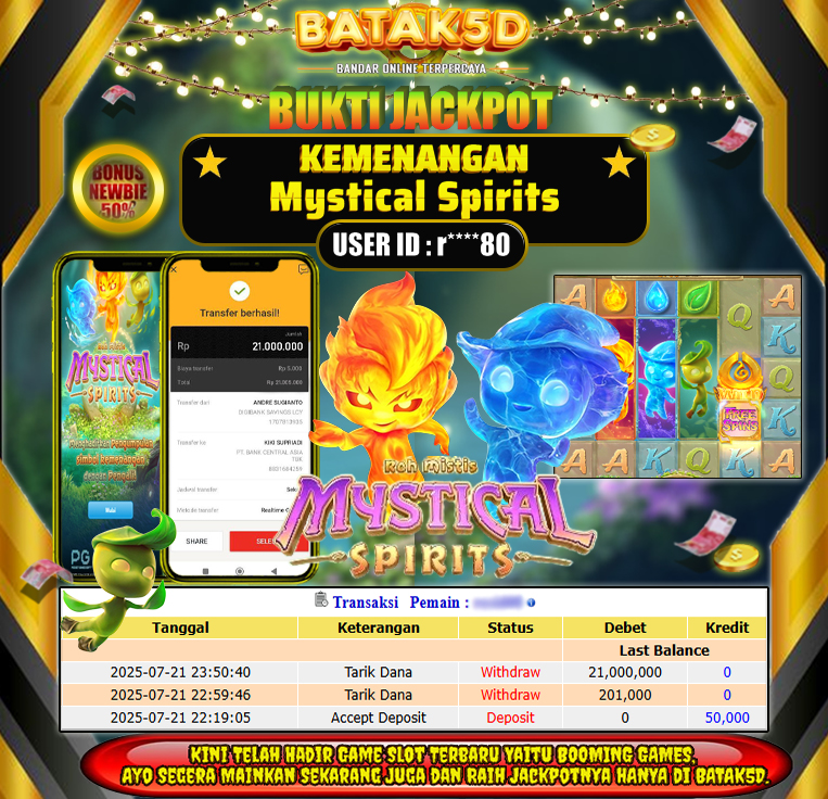 Selamat Kepada Member Setia BATAK5D dengan USER ID : r****80 di JACKPOT KEMENANGAN , Mystica Spirits RP.21,000,000 LUNAS langsung mendarat ke rekening tanpa bertele – tele. Terimakasih telah mempercayakan BATAK5D sebagai Situs Bandar Terpercaya dan Terjamin Aman! Tunggu apalagi? Daftar sekarang juga bersama BATAK5D dan dapatkan berbagai promo menarik setiap harinya.