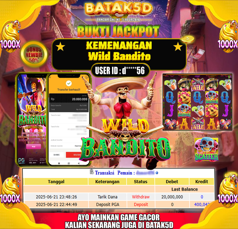 Selamat Kepada Member Setia BATAK5D dengan USER ID : d*****56 di JACKPOT KEMENANGAN , Wild Bandito RP.20,000,000 LUNAS langsung mendarat ke rekening tanpa bertele – tele. Terimakasih telah mempercayakan BATAK5D sebagai Situs Bandar Terpercaya dan Terjamin Aman! Tunggu apalagi? Daftar sekarang juga bersama BATAK5D dan dapatkan berbagai promo menarik setiap harinya.