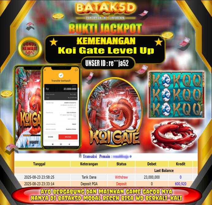 Selamat Kepada Member Setia BATAK5D dengan USER ID :RE***JA52 di JACKPOT KEMENANGAN, KOI GATE LEVEL UP RP.23,000,000 LUNAS langsung mendarat ke rekening tanpa bertele – tele. Terimakasih telah mempercayakan BATAK5D sebagai Situs Bandar Terpercaya dan Terjamin Aman! Tunggu apalagi? Daftar sekarang juga bersama BATAK5D dan dapatkan berbagai promo menarik setiap harinya.