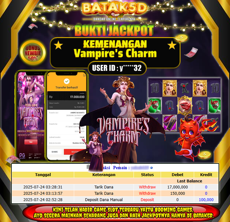 Selamat Kepada Member Setia BATAK5D dengan USER ID : y*****32 di JACKPOT KEMENANGAN , Vampire,s Charm RP.17,000,000 LUNAS langsung mendarat ke rekening tanpa bertele – tele. Terimakasih telah mempercayakan BATAK5D sebagai Situs Bandar Terpercaya dan Terjamin Aman! Tunggu apalagi? Daftar sekarang juga bersama BATAK5D dan dapatkan berbagai promo menarik setiap harinya.