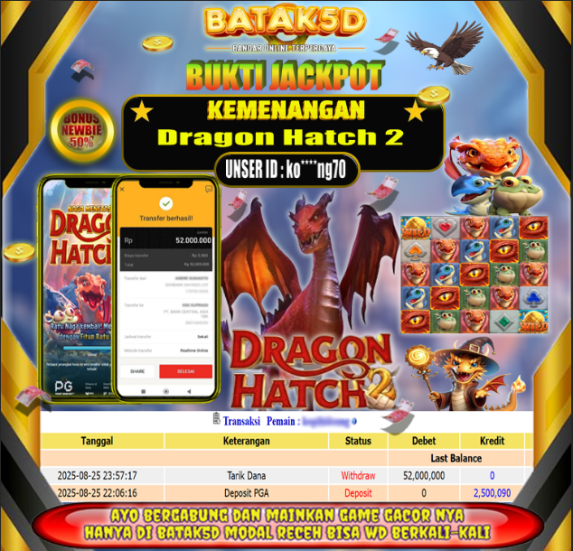 Selamat Kepada Member Setia BATAK5D dengan USER ID :KO****NG70 di JACKPOT KEMENANGAN, DRAGON HATCH 2 RP.52,000,000 LUNAS langsung mendarat ke rekening tanpa bertele – tele. Terimakasih telah mempercayakan BATAK5D sebagai Situs Bandar Terpercaya dan Terjamin Aman! Tunggu apalagi? Daftar sekarang juga bersama BATAK5D dan dapatkan berbagai promo menarik setiap harinya.