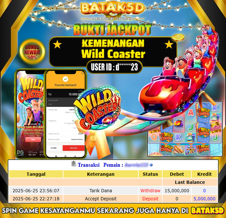 Selamat Kepada Member Setia BATAK5D dengan USER ID : d******23 di JACKPOT KEMENANGAN , Wild Coaster RP. 15,000,000 LUNAS langsung mendarat ke rekening tanpa bertele – tele. Terimakasih telah mempercayakan BATAK5D sebagai Situs Bandar Terpercaya dan Terjamin Aman! Tunggu apalagi? Daftar sekarang juga bersama BATAK5D dan dapatkan berbagai promo menarik setiap harinya.