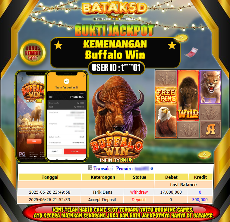 Selamat Kepada Member Setia BATAK5D dengan USER ID : t****01 di JACKPOT KEMENANGAN , Buffalo Win RP. 17,000,000 LUNAS langsung mendarat ke rekening tanpa bertele – tele. Terimakasih telah mempercayakan BATAK5D sebagai Situs Bandar Terpercaya dan Terjamin Aman! Tunggu apalagi? Daftar sekarang juga bersama BATAK5D dan dapatkan berbagai promo menarik setiap harinya.