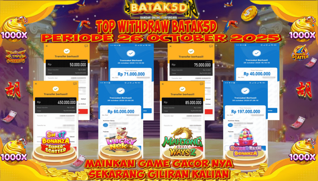 Selamat Kepada Member Setia BATAK5D dengan TOP WITHDRAW BATAK5D PERIODE 26 OCTOBER 2025 langsung mendarat ke rekening tanpa bertele – tele. Terimakasih telah mempercayakan BATAK5D sebagai Situs Bandar Terpercaya dan Terjamin Aman! Tunggu apalagi? Daftar sekarang juga bersama BATAK5D dan dapatkan berbagai promo menarik setiap harinya.