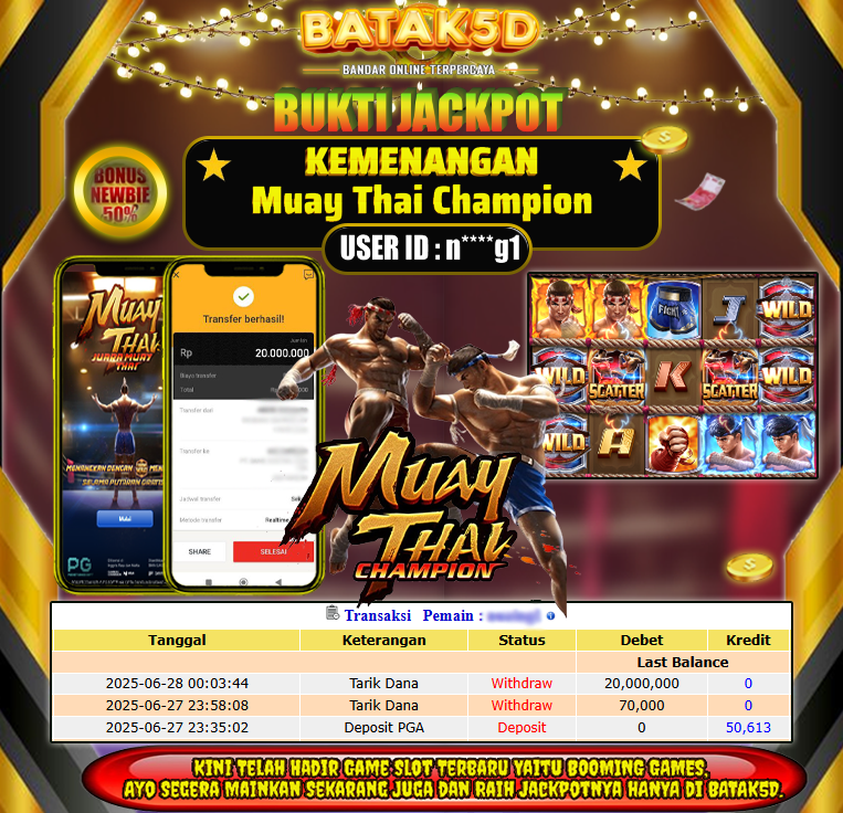 Selamat Kepada Member Setia BATAK5D dengan USER ID : n****g1 di JACKPOT KEMENANGAN , Muay Thai Champion RP. 20,000,000 LUNAS langsung mendarat ke rekening tanpa bertele – tele. Terimakasih telah mempercayakan BATAK5D sebagai Situs Bandar Terpercaya dan Terjamin Aman! Tunggu apalagi? Daftar sekarang juga bersama BATAK5D dan dapatkan berbagai promo menarik setiap harinya.