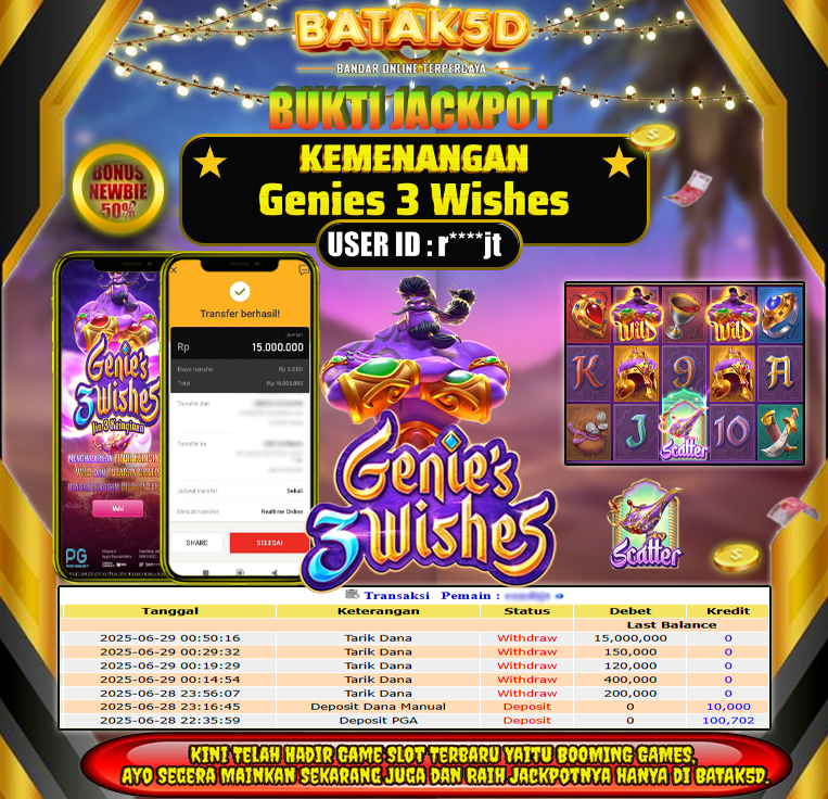 Selamat Kepada Member Setia BATAK5D dengan USER ID : r****jt di JACKPOT KEMENANGAN , Genies 3 Wishes RP. 15,000,000 LUNAS langsung mendarat ke rekening tanpa bertele – tele. Terimakasih telah mempercayakan BATAK5D sebagai Situs Bandar Terpercaya dan Terjamin Aman! Tunggu apalagi? Daftar sekarang juga bersama BATAK5D dan dapatkan berbagai promo menarik setiap harinya.