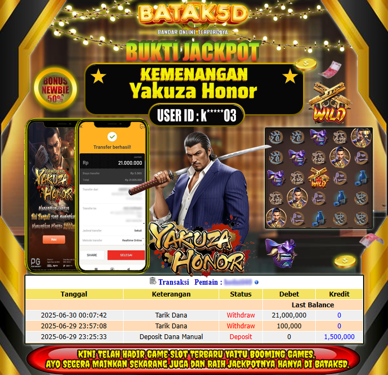 Selamat Kepada Member Setia BATAK5D dengan USER ID : k*****03 di JACKPOT KEMENANGAN , Yakuza Honor RP. 21,000,000 LUNAS langsung mendarat ke rekening tanpa bertele – tele. Terimakasih telah mempercayakan BATAK5D sebagai Situs Bandar Terpercaya dan Terjamin Aman! Tunggu apalagi? Daftar sekarang juga bersama BATAK5D dan dapatkan berbagai promo menarik setiap harinya.