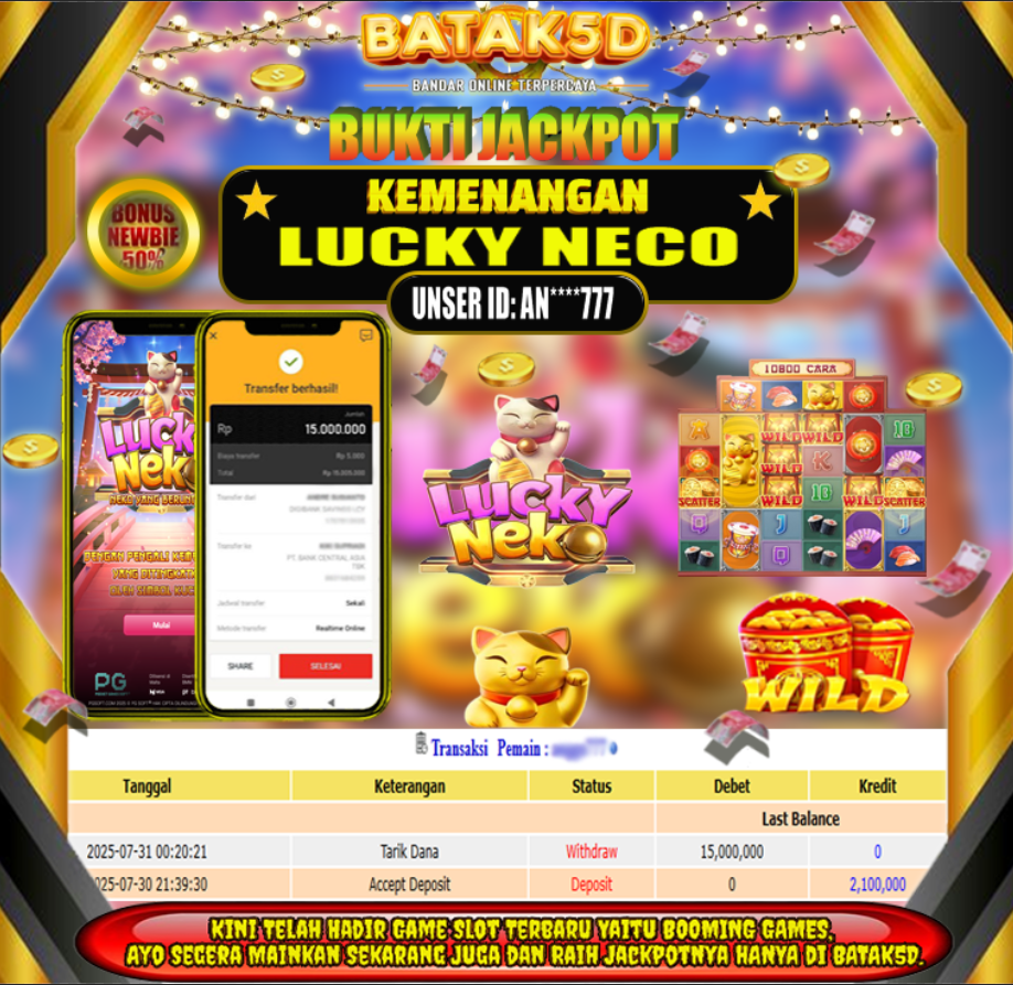 Selamat Kepada Member Setia BATAK5D dengan USER ID : AN****777 di JACKPOT KEMENANGAN , LUCKY NECO RP.15,000,000 LUNAS langsung mendarat ke rekening tanpa bertele – tele. Terimakasih telah mempercayakan BATAK5D sebagai Situs Bandar Terpercaya dan Terjamin Aman! Tunggu apalagi? Daftar sekarang juga bersama BATAK5D dan dapatkan berbagai promo menarik setiap harinya.