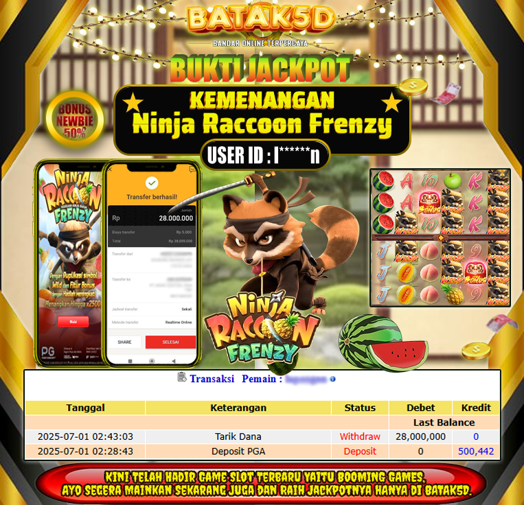 Selamat Kepada Member Setia BATAK5D dengan USER ID : l******n di JACKPOT KEMENANGAN , Ninja Raccoon Frenzy RP. 28,000,000 LUNAS langsung mendarat ke rekening tanpa bertele – tele. Terimakasih telah mempercayakan BATAK5D sebagai Situs Bandar Terpercaya dan Terjamin Aman! Tunggu apalagi? Daftar sekarang juga bersama BATAK5D dan dapatkan berbagai promo menarik setiap harinya.